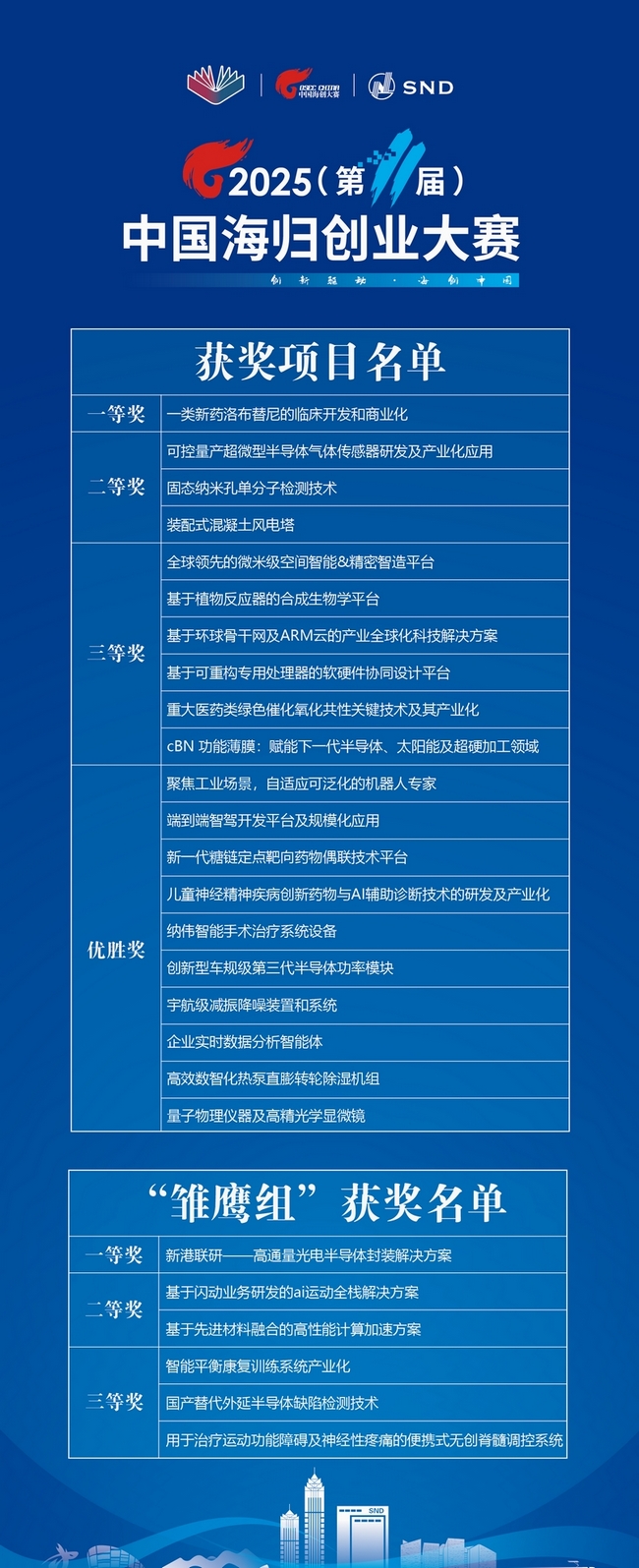 2025(第11屆)中國海歸創(chuàng)業(yè)大賽深入貫徹黨的二十大和中央人才工作會議精神,堅持平臺開放和機制創(chuàng)新,北京理工大學、南京大學首次加入聯合主辦,支持參賽人才項目與高校開展產學研深度合作。另有北京、上海、濟南、煙臺、昆山、丹陽、長沙、深圳、寧波、廈門、蘭州、呼和浩特等地20多家產業(yè)園區(qū)、科創(chuàng)載體協辦,全國300多家創(chuàng)業(yè)園區(qū)、投資機構等企事業(yè)單位和高校參與賽事,在政策、空間、資本、孵化服務等方面配置優(yōu)質資源,為項目技術產業(yè)化、商業(yè)化賦能。大賽聚焦“人才+科創(chuàng)+產業(yè)+金融”,組建專項基金撬動社會資本給予參賽項目優(yōu)先投資支持;舉辦“海創(chuàng)中國”英才行、產業(yè)融通對接會等專場活動,推動人才與科技創(chuàng)新和產業(yè)創(chuàng)新精準對接、深度融合,同時通過“海創(chuàng)中國”導師行活動和常態(tài)化機制,為參賽項目提供創(chuàng)業(yè)輔導和陪伴式服務。此外,為加強早期項目培育,本屆大賽對于未在國內注冊企業(yè)的參賽項目,單獨設立“雛鷹組”和相應賽制獎項,發(fā)揮中國海歸創(chuàng)業(yè)大賽服務基地和各方資源作用,提供定制化輔導、政策匹配及落地支持。