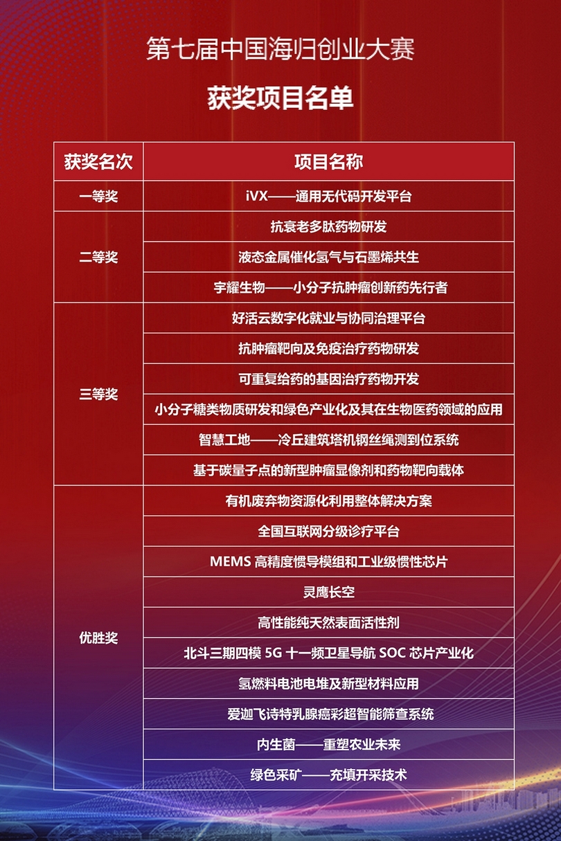 2021(第七屆)中國海歸創(chuàng)業(yè)大賽深入學(xué)習(xí)貫徹習(xí)近平總書記重要講話精神和黨的十九屆五中全會決策部署,圍繞“十四五”規(guī)劃和二〇三五年遠景目標,集聚更多創(chuàng)新要素,打造開放合作平臺,更好發(fā)揮資源互通和創(chuàng)新協(xié)同作用,在資源整合、需求對接、服務(wù)支持等方面進一步探索加強。本屆大賽自7月正式啟動以來,得到了廣大海歸創(chuàng)業(yè)企業(yè)和團隊的熱情參與。到報名截止,共有601個海歸創(chuàng)業(yè)項目通過資格審查入圍初賽,經(jīng)對項目開展實地調(diào)研和組織專家進行評審,共遴選出112個項目入圍復(fù)賽。復(fù)賽、決賽及對接洽談活動原定于2021年10月下旬在北京昌平未來科學(xué)城舉辦,因受國內(nèi)新冠肺炎疫情反彈影響而延期。考慮到目前各地疫情防控工作仍處于鞏固階段,本屆大賽復(fù)賽、決賽最終決定采用在線方式舉行。2022年6月27日至30日,由中國技術(shù)創(chuàng)業(yè)協(xié)會留學(xué)人員創(chuàng)業(yè)園聯(lián)盟和北京市昌平區(qū)人民政府共同主辦的第七屆中國海歸創(chuàng)業(yè)大賽復(fù)賽、決賽在線成功舉辦。