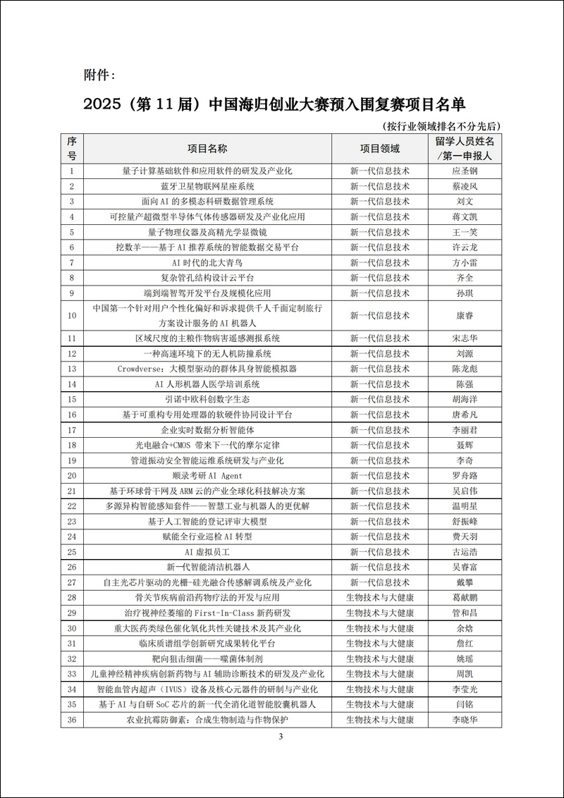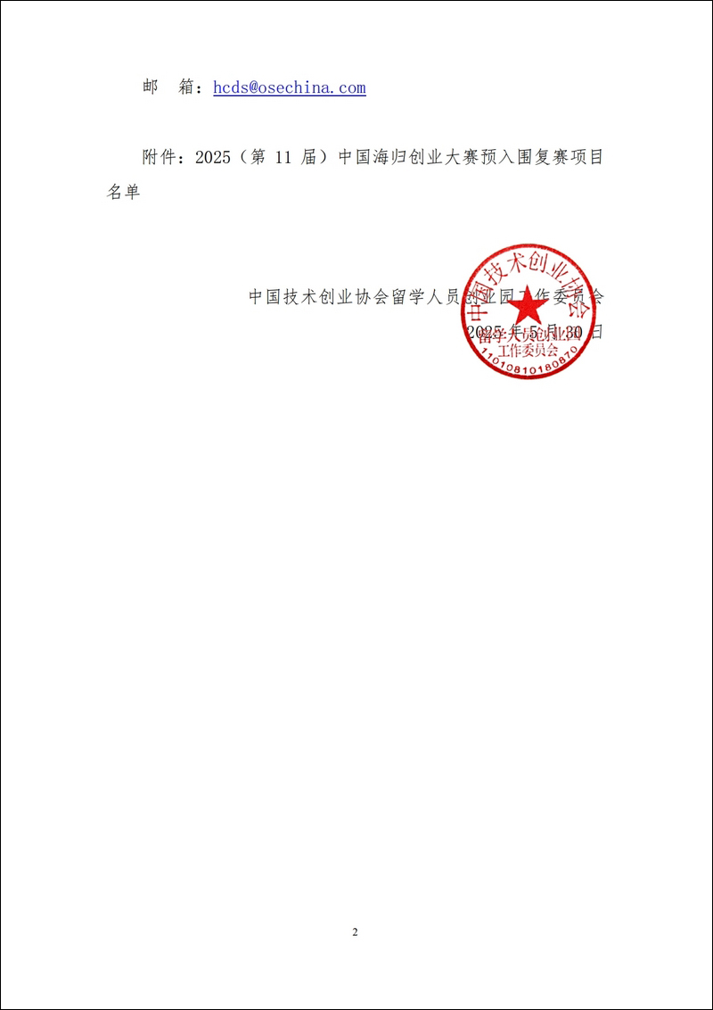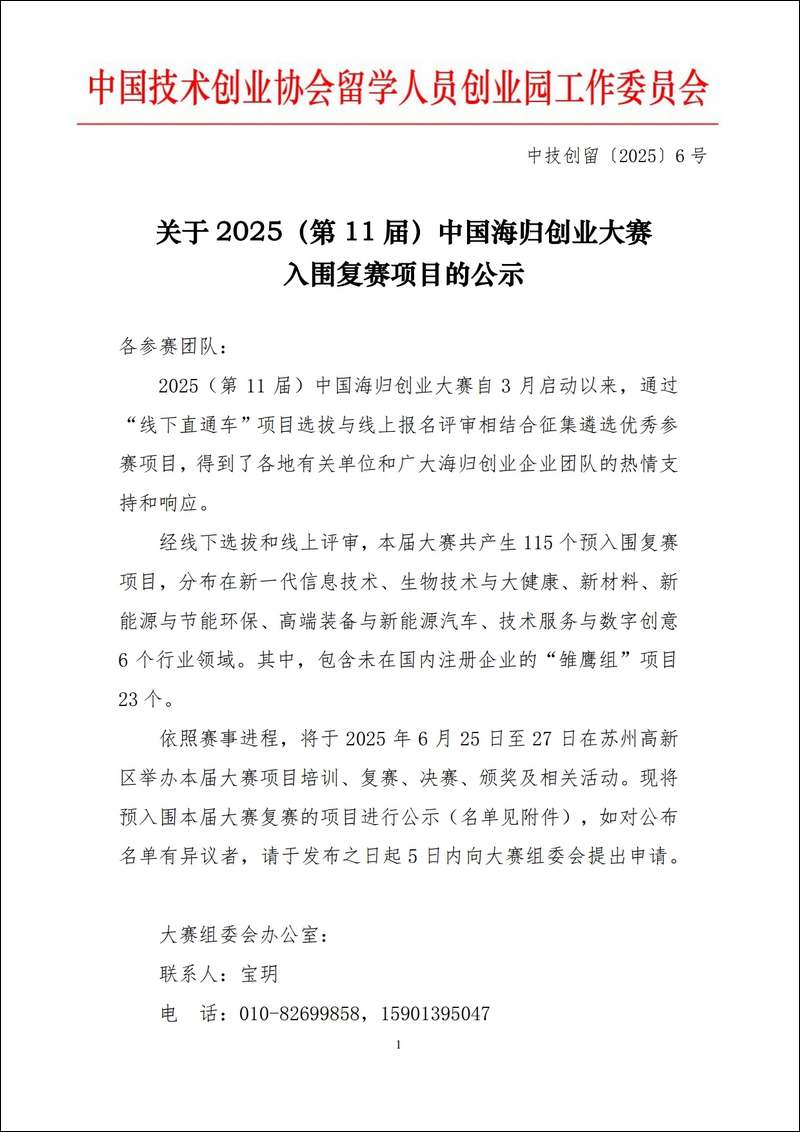 關(guān)于2025(第11屆)中國(guó)海歸創(chuàng)業(yè)大賽入圍復(fù)賽項(xiàng)目的公示